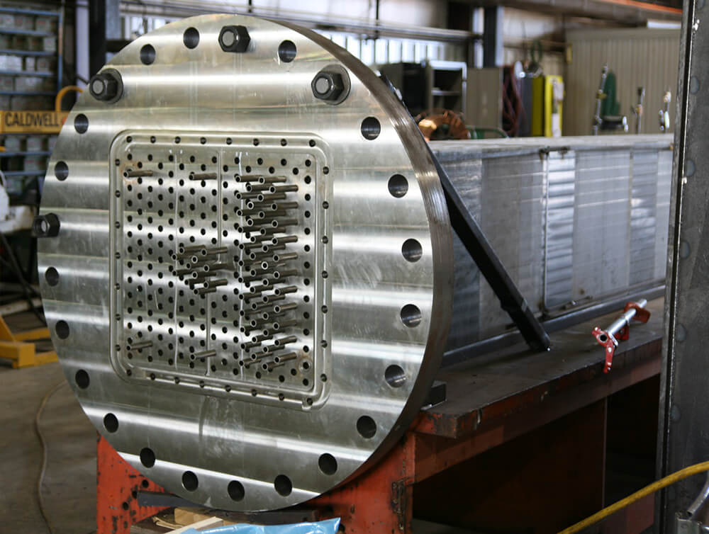 The flexible-supported-stayed-thin tubesheet design pioneered by Struthers Wells is typically 1” (25mm) thick. This allows good cooling by the water on the rear face lowering the tubesheet metal operating temperature. Tubes act as stays, remain at the same temperature, so the sheet stays flat. Flexible connection of tubesheet to shell allows for expansion and gives good fatigue resistance. In addition, the full thickness tube-to-tubesheet weld provides tubesheet integrity, eliminates crevice corrosion on the water side, and ensures equal metallurgy in the weld and on the tubesheet.